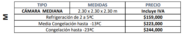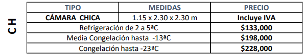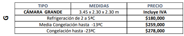 Ofrecemos una solución personalizada. Productos biológicos Bebidas Sector mortuario Flores y plantas Alimentos Sector farmacéutico Productos químicos Productos industriales Bebidas Alimentos Sector farmacéutico Productos químicos Productos biológicos Sector mortuario Productos industriales Flores y plantas Herrajes de alta calidad Cámaras Estandarizadas Cámara XCH Incluyen:Paneles de PoliuretanoUnidad condensadora (BOHN)Evaporador (BOHN)Accesorios mecánicos unidad condensadoraPuerta abatibleControl de refrigeraciónAccesorios mecánicos para unidad condensadora en cámara decongelaciónIncluye aislamiento en piso (solo cámaras de congelación) No incluyeFlete/TransporteInstalación de panelInstalación de equipos Cámara CH Incluyen:Paneles de PoliuretanoUnidad condensadora (BOHN)Evaporador (BOHN)Accesorios mecánicos unidad condensadoraPuerta abatibleControl de refrigeraciónAccesorios mecánicos para unidad condensadora en cámara decongelaciónIncluye aislamiento en piso (solo cámaras de congelación) No incluyeFlete/TransporteInstalación de panelInstalación de equipos Cámara M Incluyen:Paneles de PoliuretanoUnidad condensadora (BOHN)Evaporador (BOHN)Accesorios mecánicos unidad condensadoraPuerta abatibleControl de refrigeraciónAccesorios mecánicos para unidad condensadora en cámara decongelaciónIncluye aislamiento en piso (solo cámaras de congelación) No incluyeFlete/TransporteInstalación de panelInstalación de equipo Cámara G Incluyen: Paneles de Poliuretano Unidad condensadora (BOHN) Evaporador (BOHN) Accesorios mecánicos unidad condensadora Puerta abatible Control de refrigeración Accesorios mecánicos para unidad condensadora en cámara decongelación Incluye aislamiento en piso (solo cámaras de congelación No incluyeFlete/TransporteInstalación de panelInstalación de equipo Aliados Comerciales Clientes Satisfechos